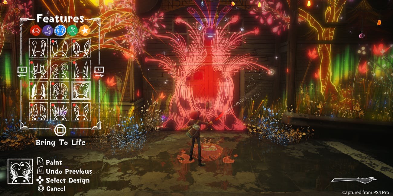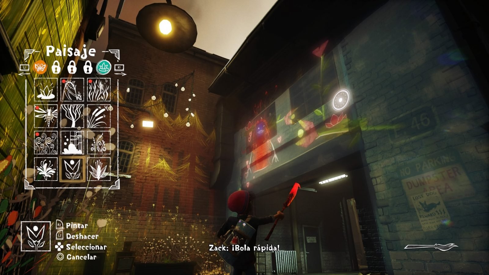 Como ya os he comentado como el juego quiere que nos sintamos como si fuésemos el propio Ash, que veamos el mundo como lo vería a él y, sobre todo, que pintemos las paredes como lo haría él. Para crear este vínculo, el juego utiliza como excusa el pincel mágico (que será a su vez el hilo conductor de la historia) para concederle a Ash, y por ende a nosotros, el poder de proyectar sus dibujos.